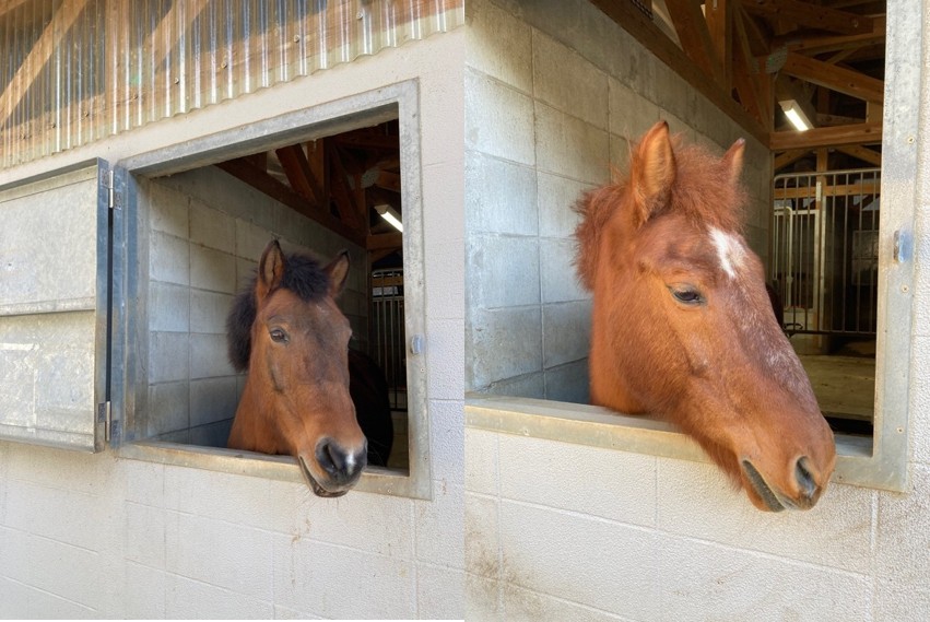 厩舎の窓からひょっこり顔を出してくれた子たち。とてもおとなしく,優しい顔立ちの対州馬
