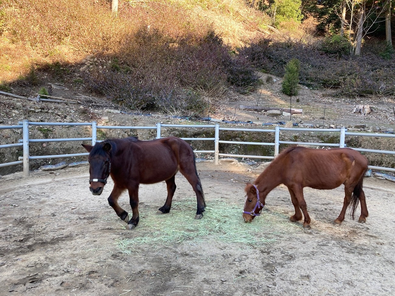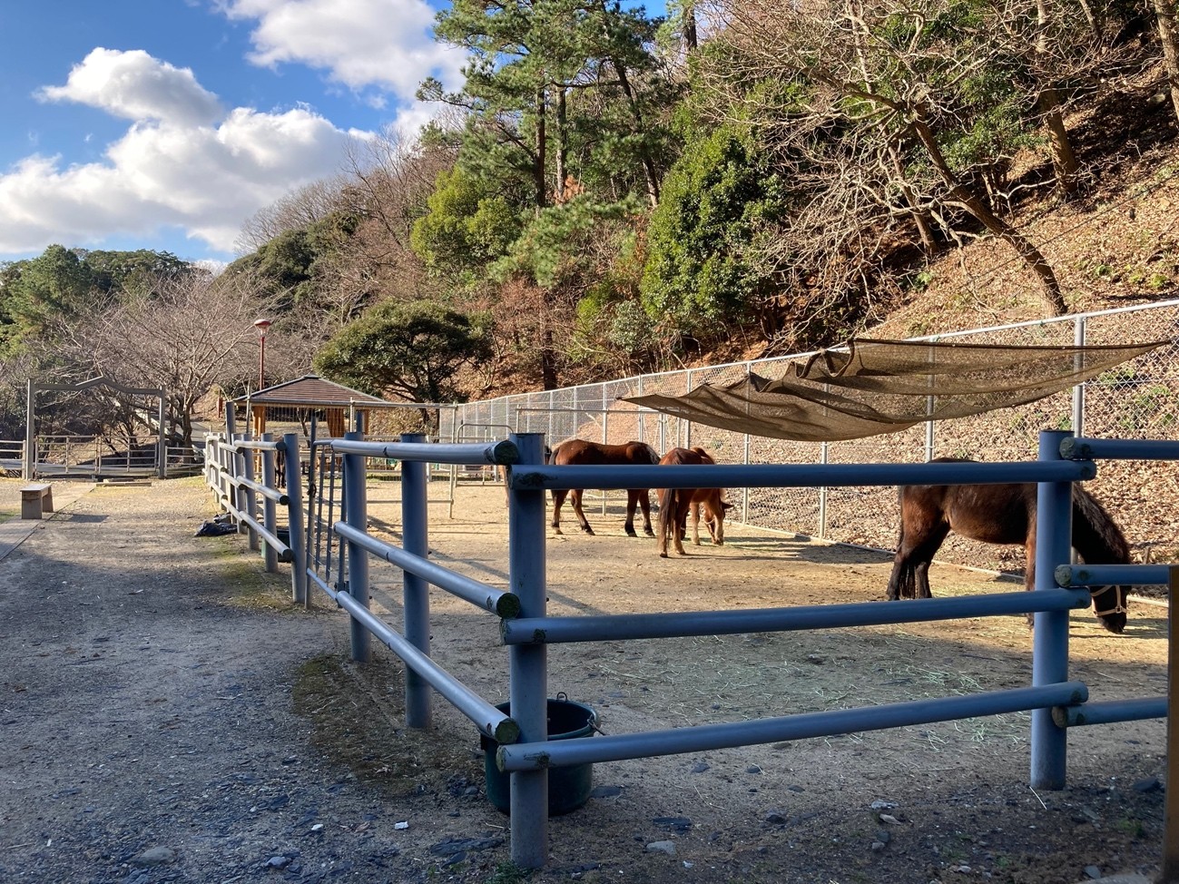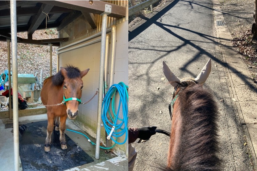 体験乗馬中の馬上から。右は外でお散歩中の対州馬。体高が人より低いことがわかる。乗馬後も名残惜しくてしばらく見学させていただいた。寒かったがずっとここにいたかった。