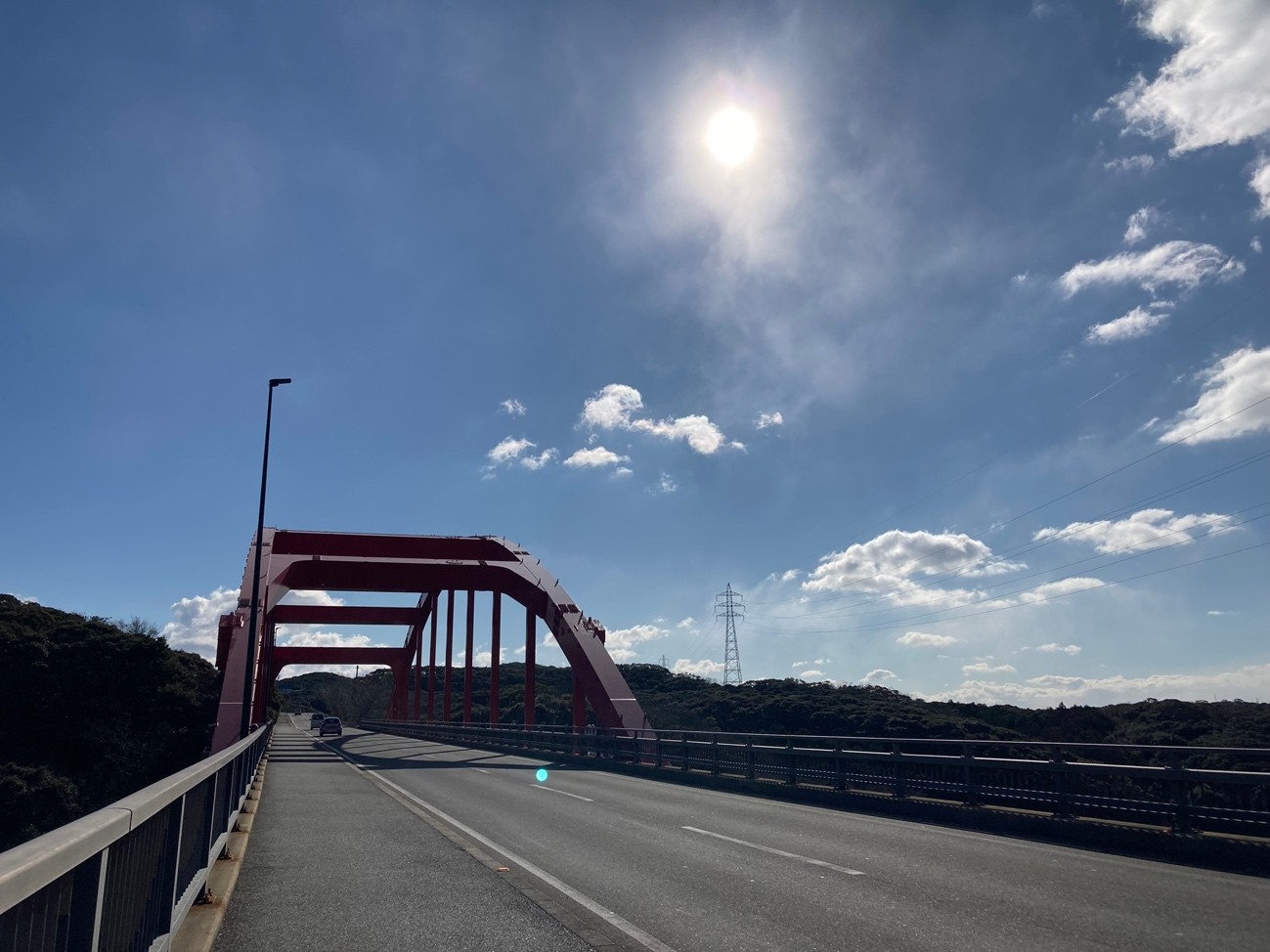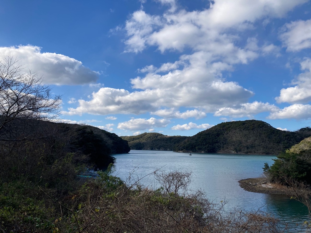 まだ午前11時。この後どうする? あそうベイパークから30分程度歩けば,万関橋という名勝に着き,バス停やお店が少しあるということで歩くことにした。途中の景色が美しい。歩かなければ観られない景色。これも旅の醍醐味。