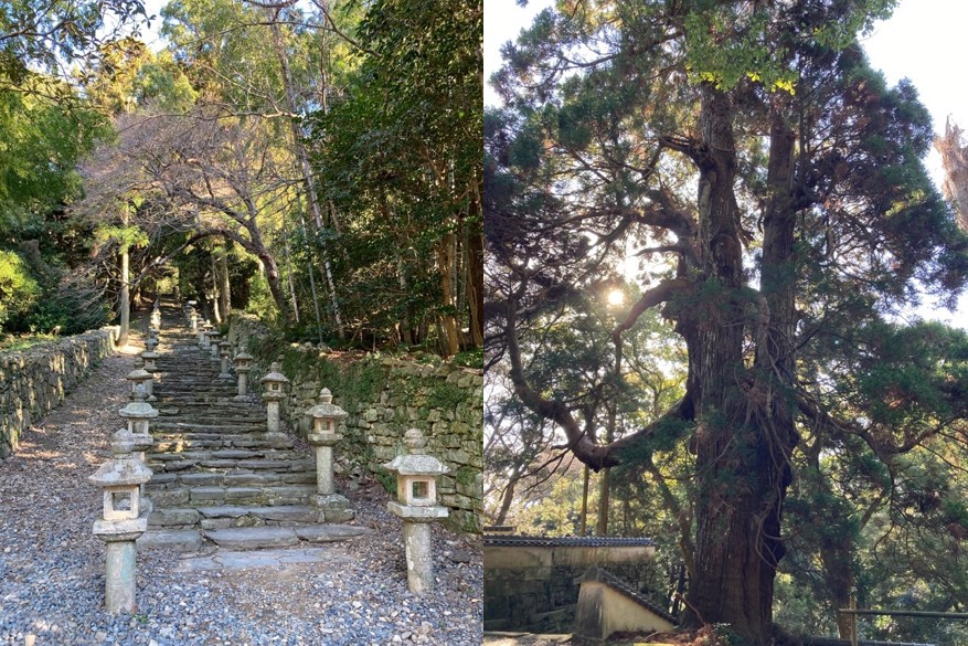 徒歩7,8分のところにある対馬藩主宗氏の菩提寺である万松院(ばんしょういん)へ。百雁木(ひゃくがんぎ)という石段を登りながら宗氏一族の大きな墓所を巡る。日本三大墓所の一つに数えられている。途中に天然記念物の大杉があり圧巻だ。この大杉の存在が万松院の幽玄さをさらに引き立たせている。