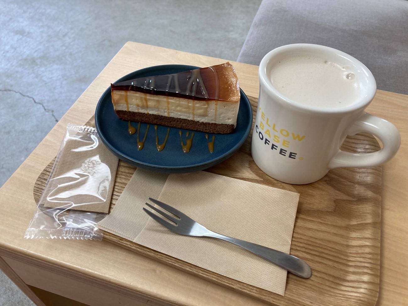 YELLOW BASE COFFEEの微糖カフェオレとケーキ