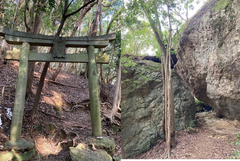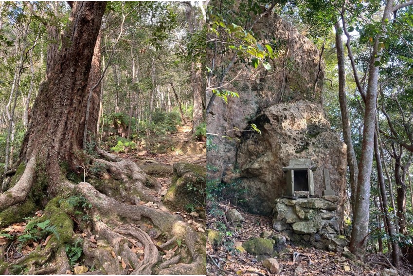 途中にみられる祠と原生林